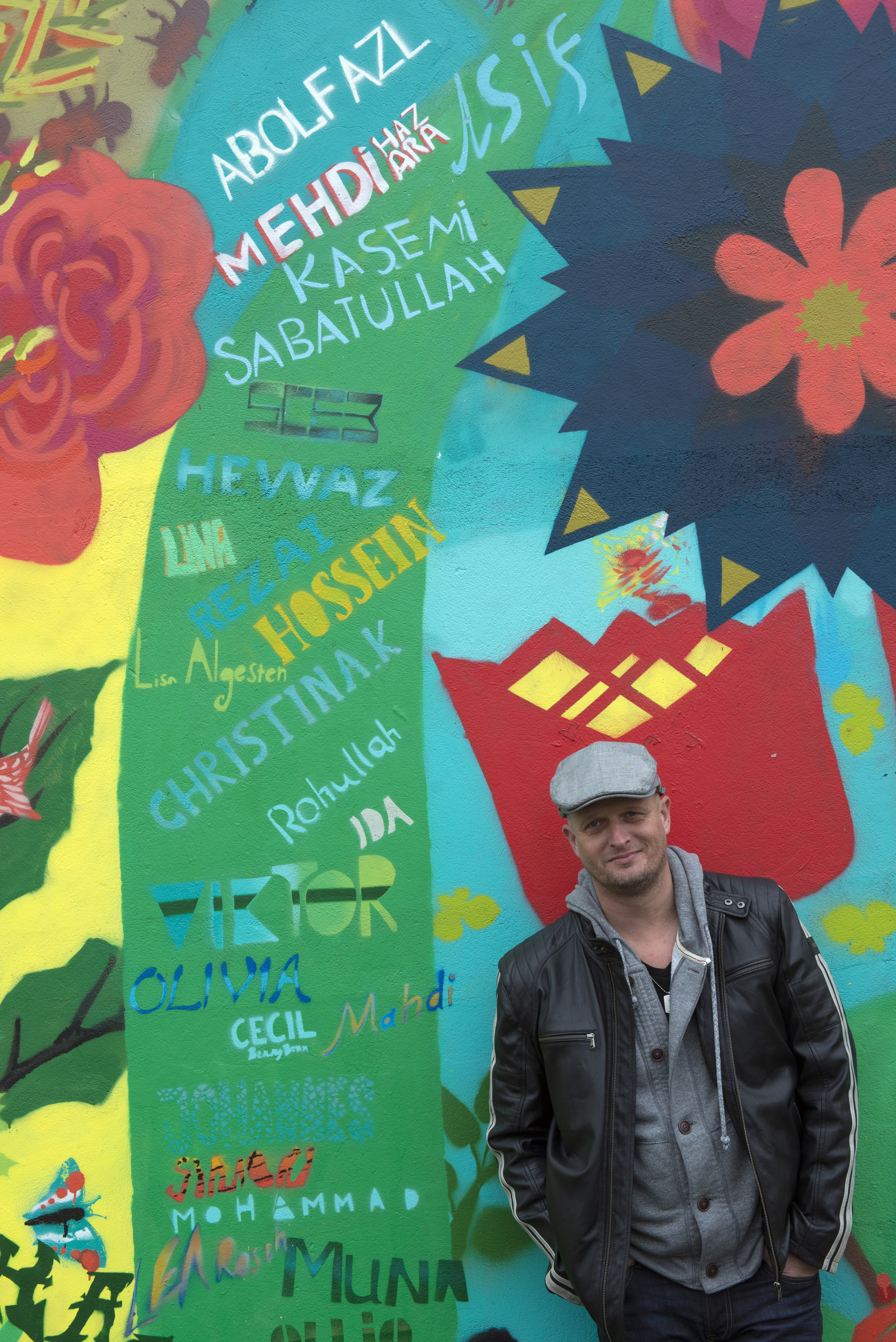 Muralmålningen i centrala Arvika skapades i somras av svenska ungdomar och ungdomar från HVB för ensamkommande. Peter Sandvall är stolt över vad hans ungdomar har åstadkommit. Foto: BÖRGE NILSSON/Textra